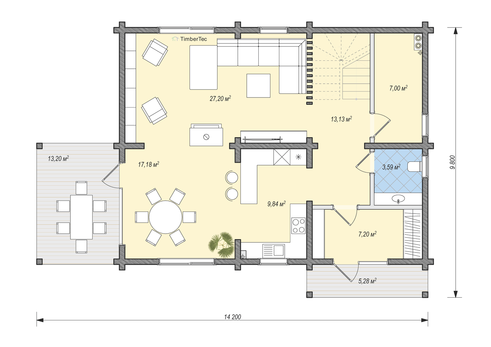 С директен излаз към голяма тераса (13,20 м²) за семейни събирания на открито.