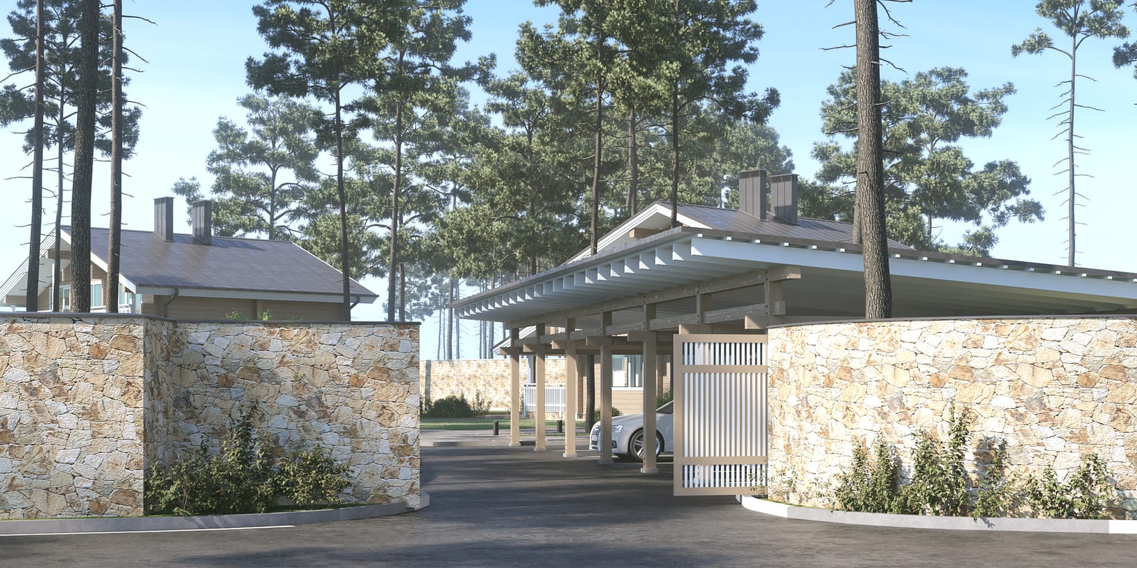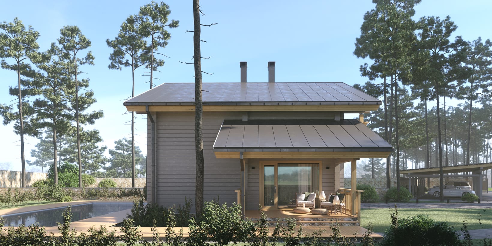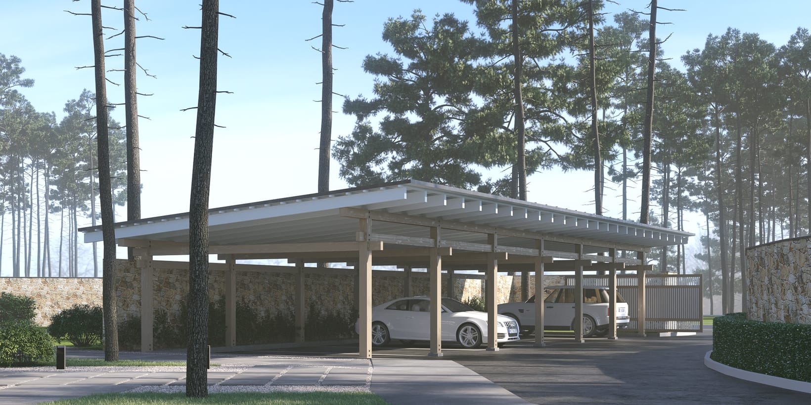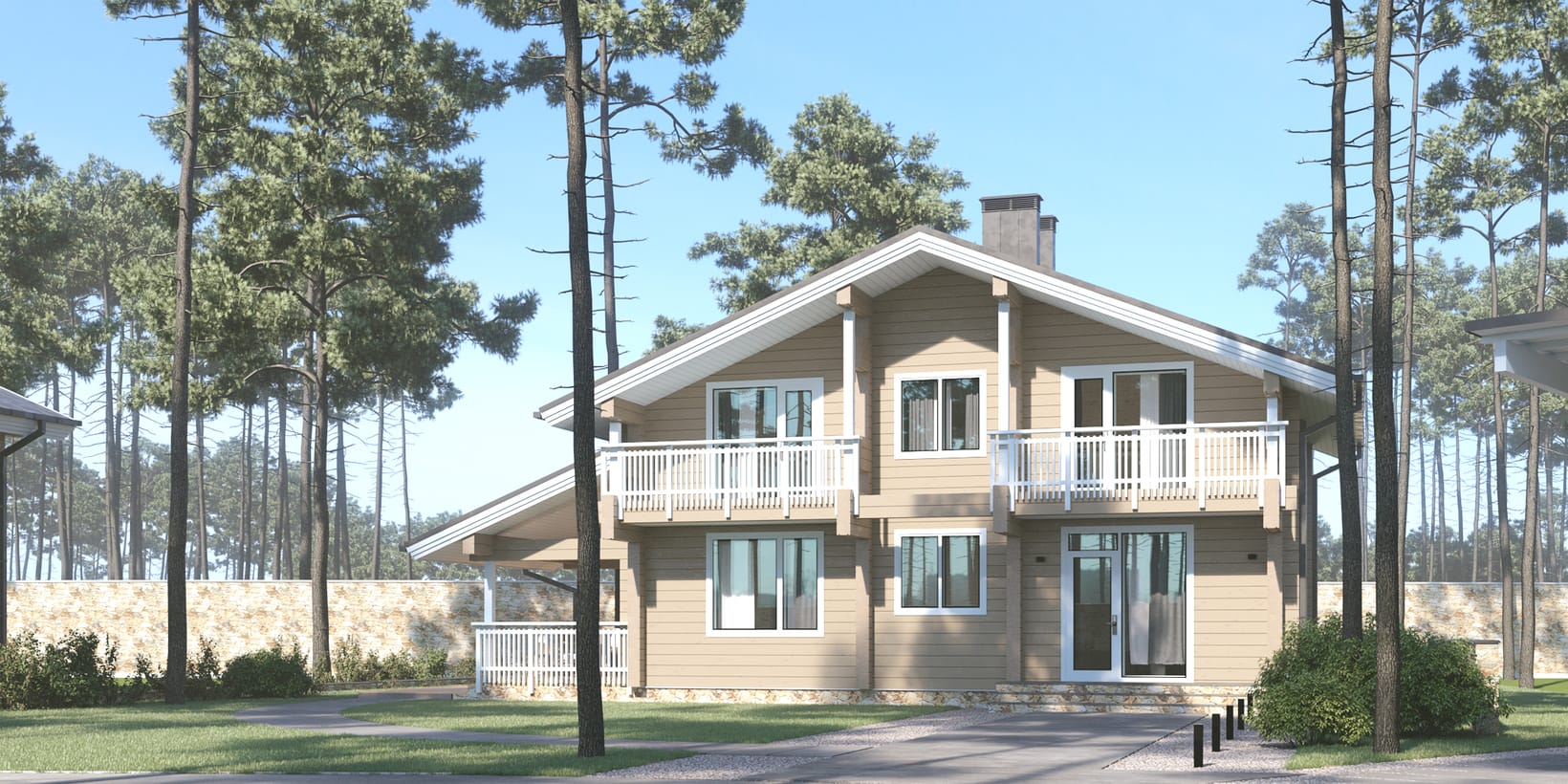Лепени масивни греди (150 × 280 mm). Изсушени до 12–14% влажност, CNC обработка и система „неслягащи греди“.